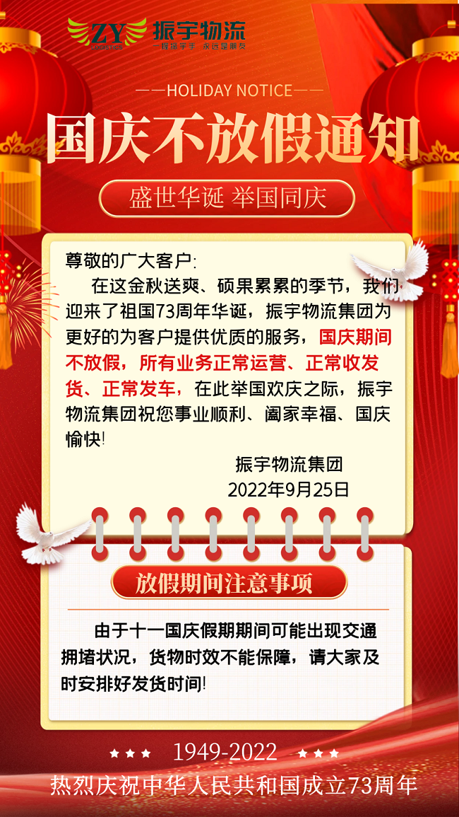 在這金秋送爽、碩果累累的季節(jié),我們迎來了祖國73周年華誕,振宇物流集團為更好的為客戶提供優(yōu)質(zhì)的服務,國慶期間不放假,所有業(yè)務正常運營、正常收發(fā)貨、正常發(fā)車,在此舉國歡慶之際,振宇物流集團祝您事業(yè)順利、闔家幸福、國慶愉快!